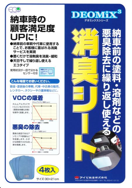 「消臭シート(4枚入り)」納車前の塗料・溶剤などの悪臭除去に繰り返し使える消臭シートです。置くだけで、嫌な臭いを除去・緩和でき、天日干しで繰り返し使えるエコタイプです。板金・塗装後の車両、代車・中古車の販売、レンタカーなどにオススメです。(2010.7)